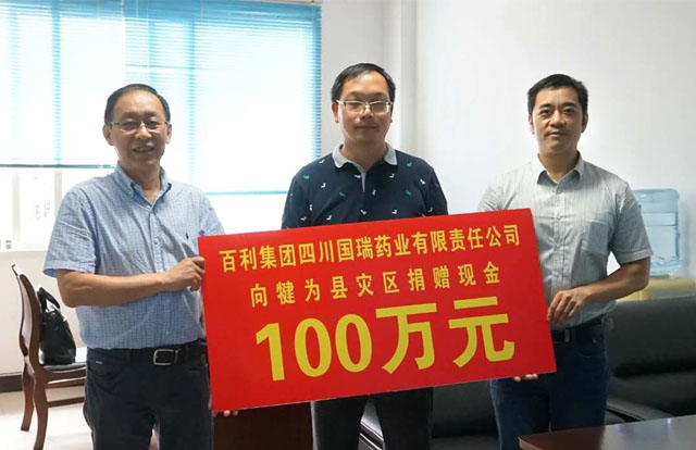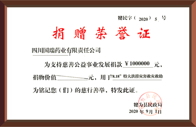 2020年8月18日,,,,,四川省犍为县遭遇百年未遇特大洪涝灾难,,,,,taptap开户-taptap体育注册集团国瑞药业向犍为县灾区捐赠现金100万元。。。。。。。。