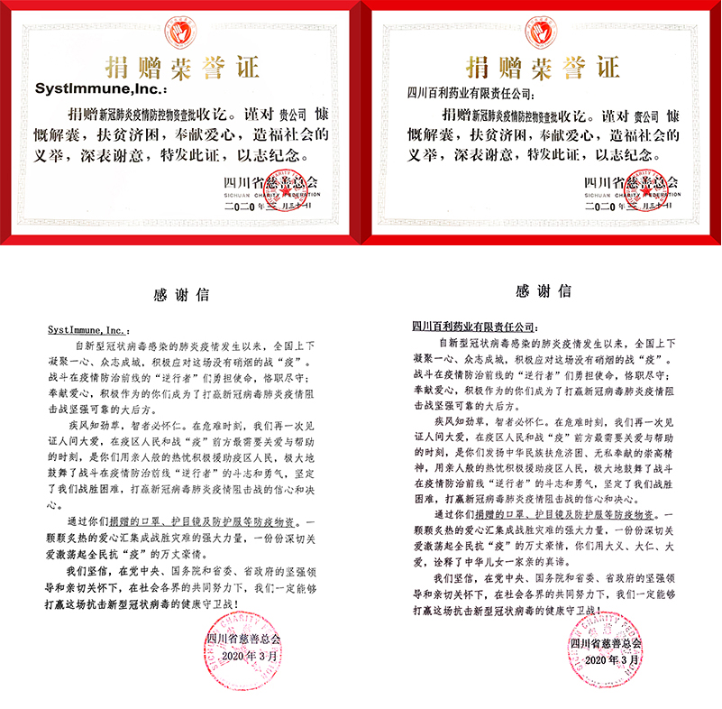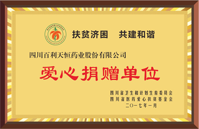 2016年和2017年,,,,,,,向四川省医药爱心扶贫基金会首批医疗爱心救助项目捐赠,,,,,,,荣获“爱心捐赠单位”称呼。。。。。